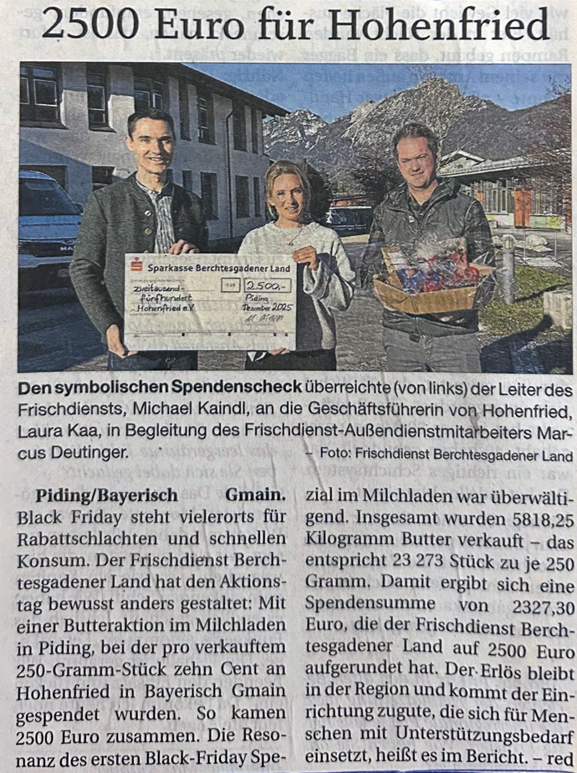 Piding/Bayerisch Gmain. Black Friday steht vielerorts für Rabattschlachten und schnellen Konsum. Der Frischdienst Berchtesgadener Land hat den Aktionstag bewusst anders gestaltet: Mit einer Butteraktion im Milchladen in Piding, bei der pro verkauftem 250-Gramm-Stück zehn Cent an Hohenfried in Bayerisch Gmain gespendet wurden. So kamen 2500 Euro zusammen. Die Resonanz des ersten Black-Friday-Spezials im Milchladen war überwältigend. Insgesamt wurden 5818,25 Kilogramm Butter verkauft – das entspricht 23 273 Stück zu je 250 Gramm. Damit ergibt sich eine Spendensumme von 2327,30 Euro, die der Frischdienst Berchtesgadener Land auf 2500 Euro aufgerundet hat. Der Erlös bleibt in der Region und kommt der Einrichtung zugute, die sich für Menschen mit Unterstützungsbedarf einsetzt, heißt es im Bericht. – red