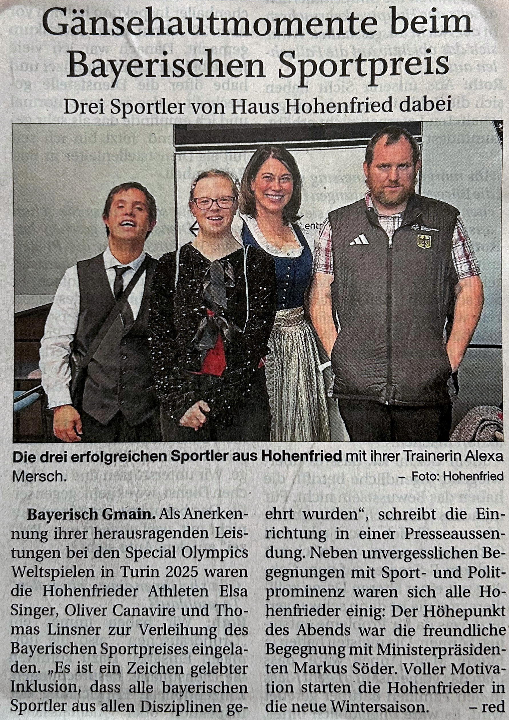 Bayerisch Gmain – Als Anerkennung ihrer herausragenden Leistungen bei den Special Olympics Weltspielen in Turin 2025 waren die Hohenfrieder Athleten Elsa Singer, Oliver Canavire und Thomas Lisner zur Verleihung des Bayerischen Sportpreises eingeladen. „Es ist ein Zeichen gelebter Inklusion, dass alle bayerischen Sportler aus allen Disziplinen geehrt wurden“, schreibt die Einrichtung in einer Presse¬aussendung. Neben unvergesslichen Begegnungen mit Sport- und Polit¬prominenz waren sich alle Hohenfrieder einig: Der Höhepunkt des Abends war die freundliche Begegnung mit Ministerpräsident Markus Söder. Voller Motivation starten die Hohenfrieder in die neue Wintersaison.