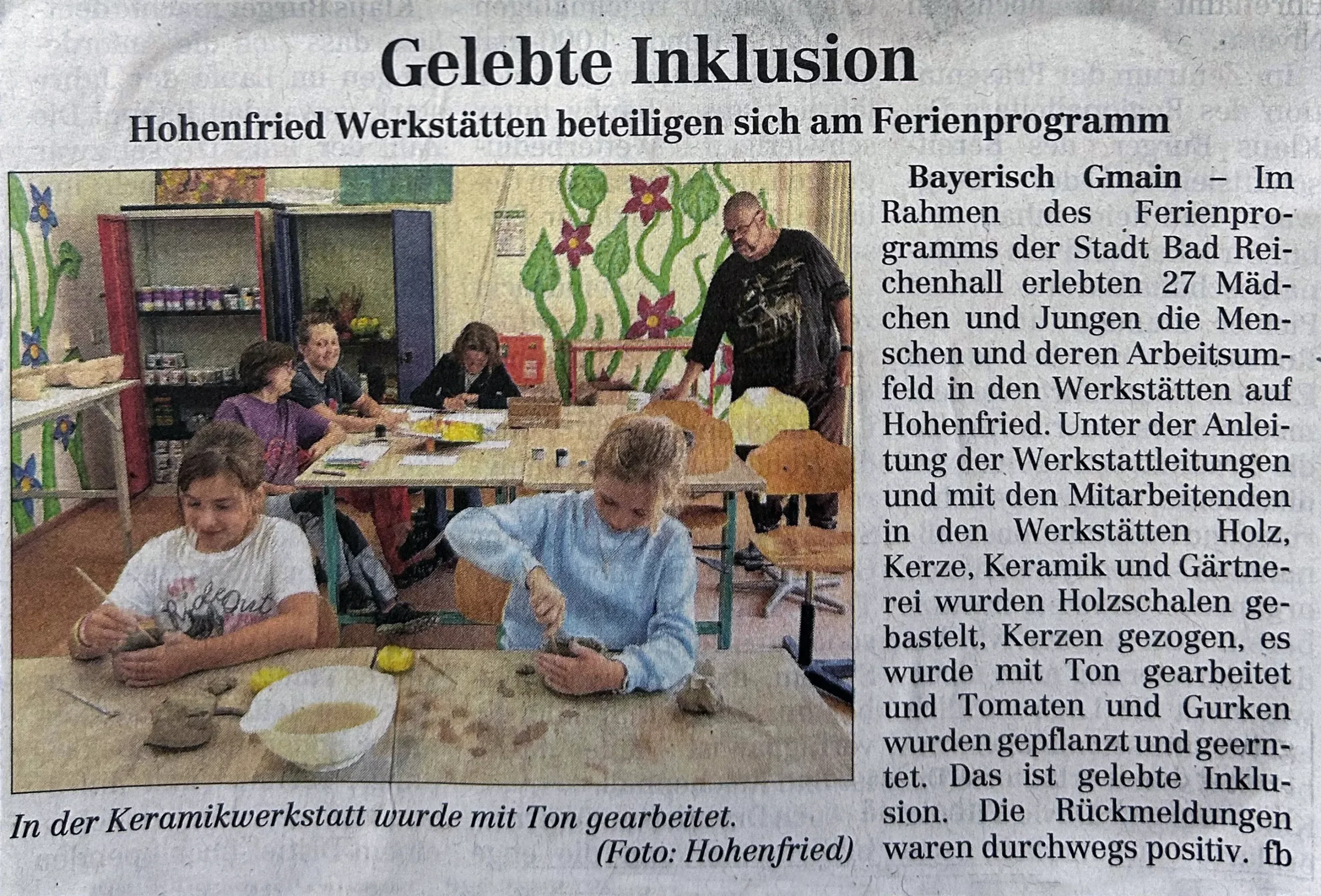 Bayerisch Gmain – Im Rahmen des Ferienprogramms der Stadt Bad Reichenhall erlebten 27 Mädchen und Jungen die Menschen und deren Arbeitsumfeld in den Werkstätten auf Hohenfried. Unter der Anleitung der Werkstattleitungen und mit den Mitarbeitenden in den Werkstätten Holz, Kerze, Keramik und Gärtnerei wurden Holzschalen gebastelt, Kerzen gezogen, es wurde mit Ton gearbeitet und Tomaten und Gurken wurden gepflanzt und geerntet. Das ist gelebte Inklusion. Die Rückmeldungen waren durchwegs positiv.