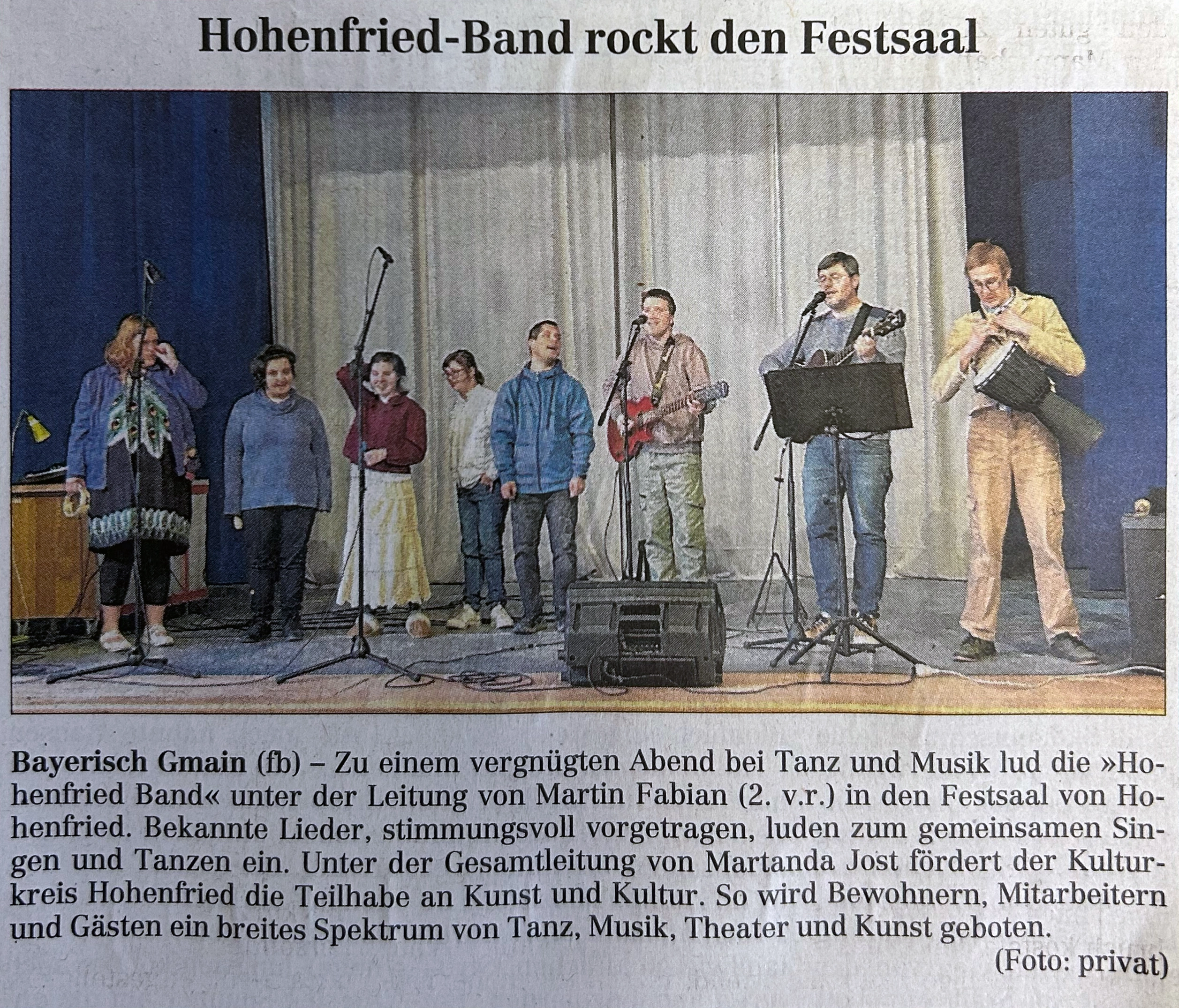 In Hohenfried gab es einen schönen Abend mit Musik und Tanz. Die Hohenfried-Band spielte im Festsaal. Die Leitung hatte Martin Fabian. Die Band spielte bekannte Lieder. Viele Menschen konnten mitsingen und tanzen. Der Kulturkreis Hohenfried unterstützt Kunst und Kultur. Die Gesamtleitung hat Martanda Jost. In Hohenfried gibt es viele Angebote für Bewohner, Mitarbeiter und Gäste. Dazu gehören Tanz, Musik, Theater und Kunst.
