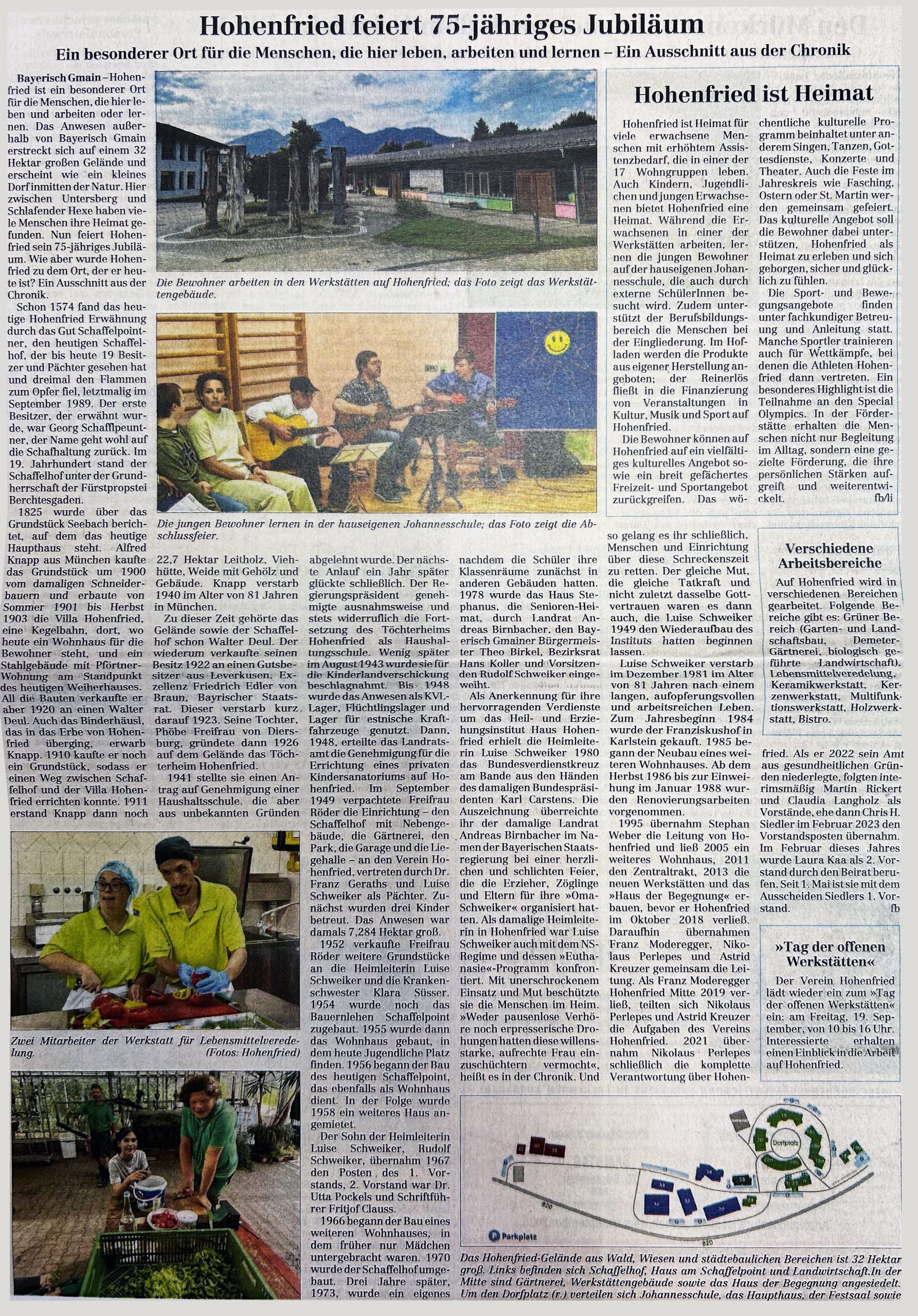 Bayerisch Gmain – Hohenfried ist ein besonderer Ort für die Menschen, die hier leben und arbeiten oder lernen. Das Anwesen außerhalb von Bayerisch Gmain erstreckt sich auf einem 32 Hektar großen Gelände und erscheint wie ein kleines Dorf inmitten der Natur. Hier zwischen Untersberg und Schlafender Hexe haben viele Menschen ihre Heimat gefunden. Nun feiert Hohenfried sein 75-jähriges Jubiläum. Wie aber wurde Hohenfried zu dem Ort, der er heute ist? Ein Ausschnitt aus der Chronik. Schon 1574 fand das heutige Hohenfried Erwähnung durch das Gut Schaffelpointner, den heutigen Schaffelhof, der bis heute 19 Besitzer und Pächter gesehen hat und dreimal den Flammen zum Opfer fiel, letztmalig im September 1989. Der erste Besitzer, der erwähnt wurde, der Name geht wohl auf die Schafhaltung zurück. Im 19. Jahrhundert stand der Schaffelhof unter der Grundherrschaft der Fürstpropstei Berchtesgaden. 1825 wurde über das Grundstück Seebach berichtet, auf dem das heutige Haupthaus steht. Alfred Knapp aus München kaufte das Grundstück um 1900 vom damaligen Schneiderbauern und erbaute von Sommer 1901 bis Herbst 1903 die Villa Hohenfried, eine Kegelbahn, dort, wo heute ein Wohnhaus für die Bewohner steht, und ein Stahlgebäude mit Pförtner-Wohnung am Standpunkt des heutigen Weiherhauses. All die Bauten verkaufte er aber 1920 an einen Walter Deul. Auch das Binderhäusl, das in das Erbe von Hohenfried überging, erwarb Knapp. 1910 kaufte er noch ein Grundstück, sodass er einen Weg zwischen Schaffelhof und der Villa Hohenfried errichten konnte.