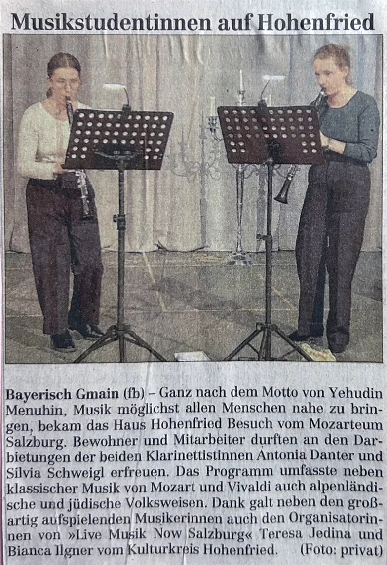 Ganz nach dem Motto von Yehudin Menuhin, Musik möglichst allen Menschen nahe zu bringen, bekam das Haus Hohenfried Besuch vom Mozarteum Salzburg. Bewohner und Mitarbeiter durften an den Darbietungen der beiden Klarinettistinnen Antonia Danter und Silvia Schweigl erfreuen. Das Programm umfasste neben klassischer Musik von Mozart und Vivaldi auch alpenländische und jüdische Volksweisen. Dank galt neben den großartig aufspielenden Musikerinnen auch den Organisatorinnen von »Live Musik Now Salzburg« Teresa Jedina und Bianca Ilgner vom Kulturkreis Hohenfried.