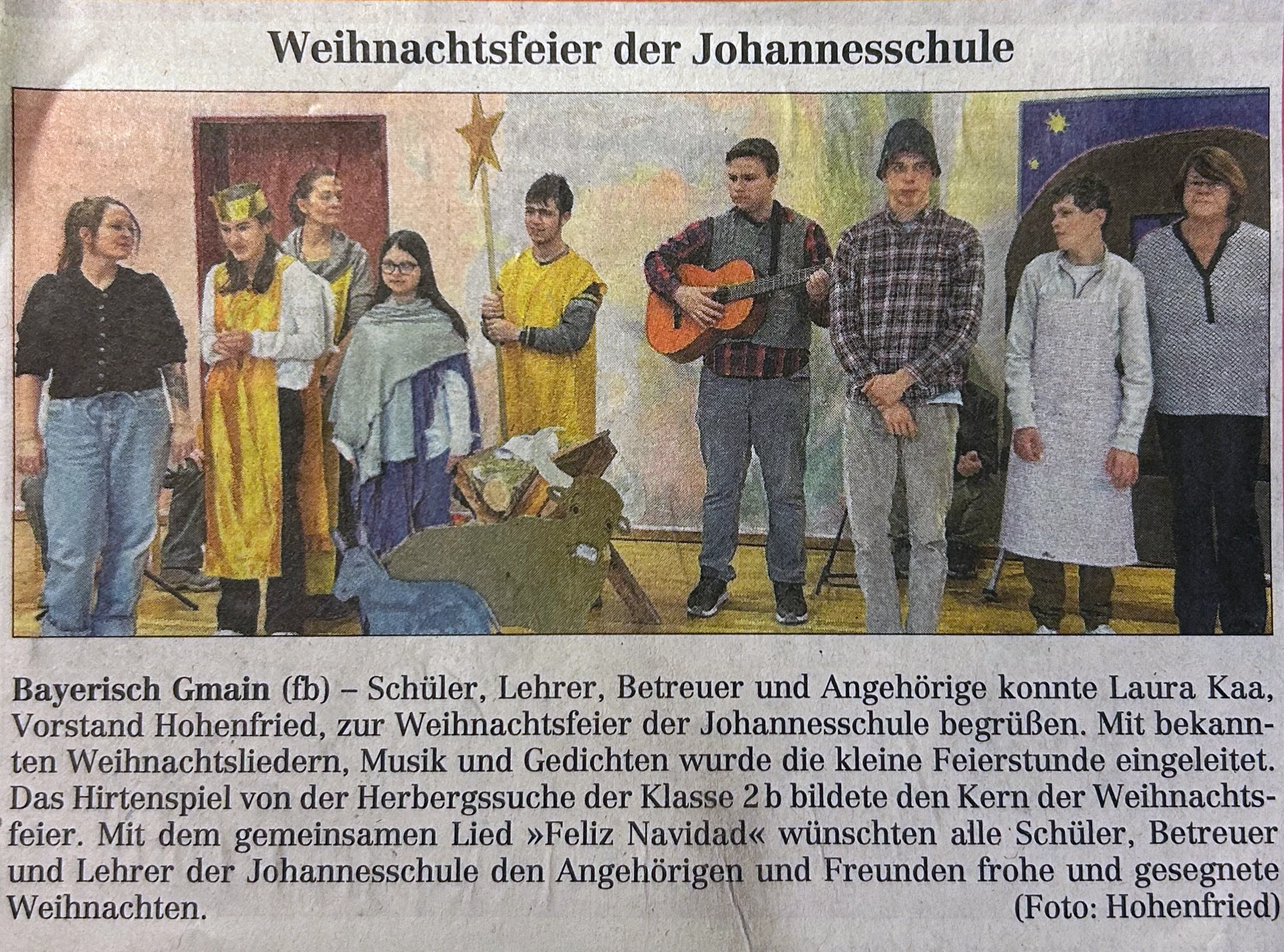 Bayerisch Gmain (fb) – Schüler, Lehrer, Betreuer und Angehörige konnte Laura Kaa, Vorstand Hohenfried, zur Weihnachtsfeier der Johannesschule begrüßen. Mit bekannten Weihnachtsliedern, Musik und Gedichten wurde die kleine Feierstunde eingeleitet. Das Hirtenspiel von der Herbergssuche der Klasse 2 b bildete den Kern der Weihnachtsfeier. Mit dem gemeinsamen Lied „Feliz Navidad“ wünschten alle Schüler, Betreuer und Lehrer der Johannesschule den Angehörigen und Freunden frohe und gesegnete Weihnachten.